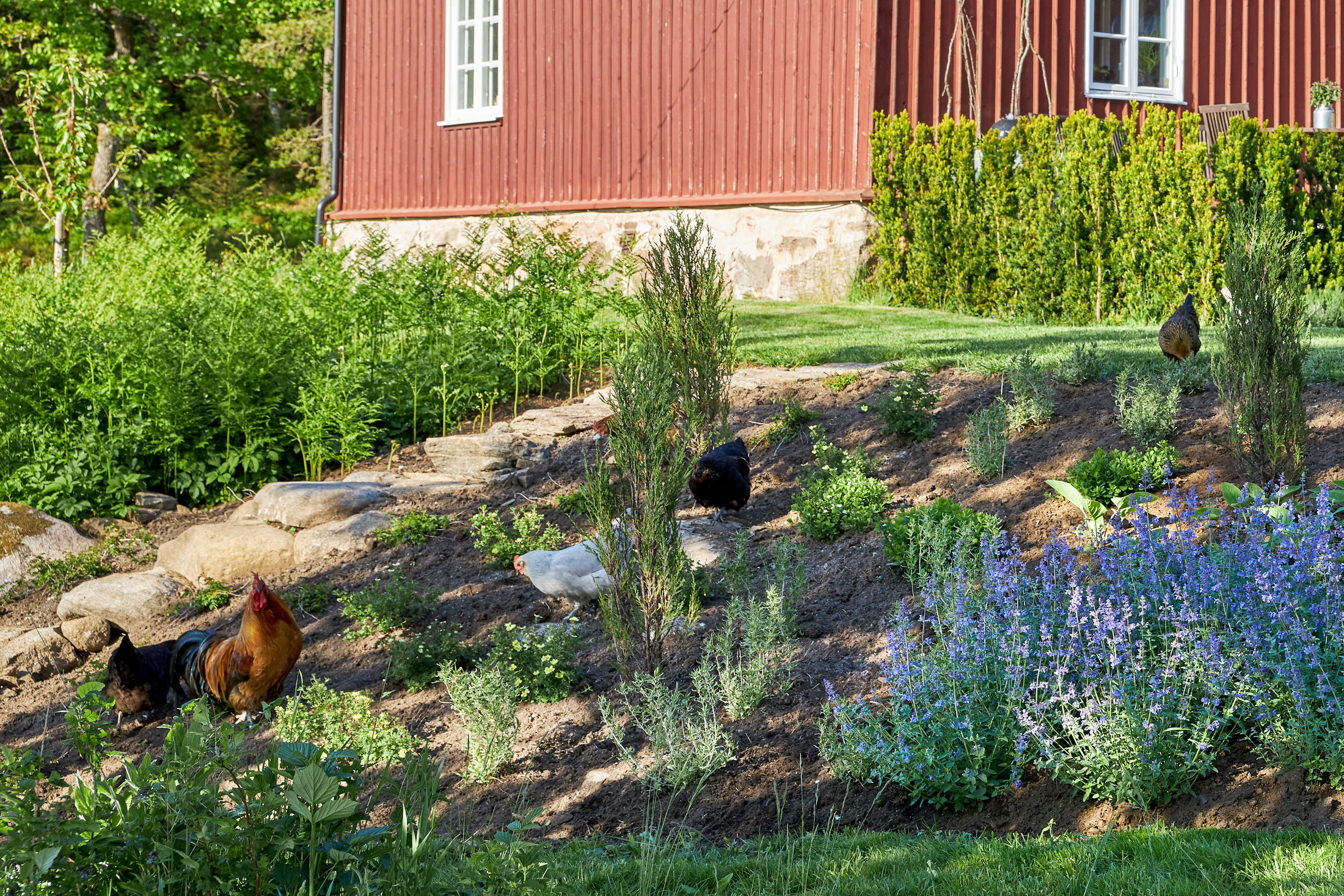 I slänten planterades även några röd-enar ’Blue Arrow’. Dessa får representera cypresser som är vanliga i Provence. Röd-enen bidrar också till att få lite höjd i släntrabatten, för att bryta av.
