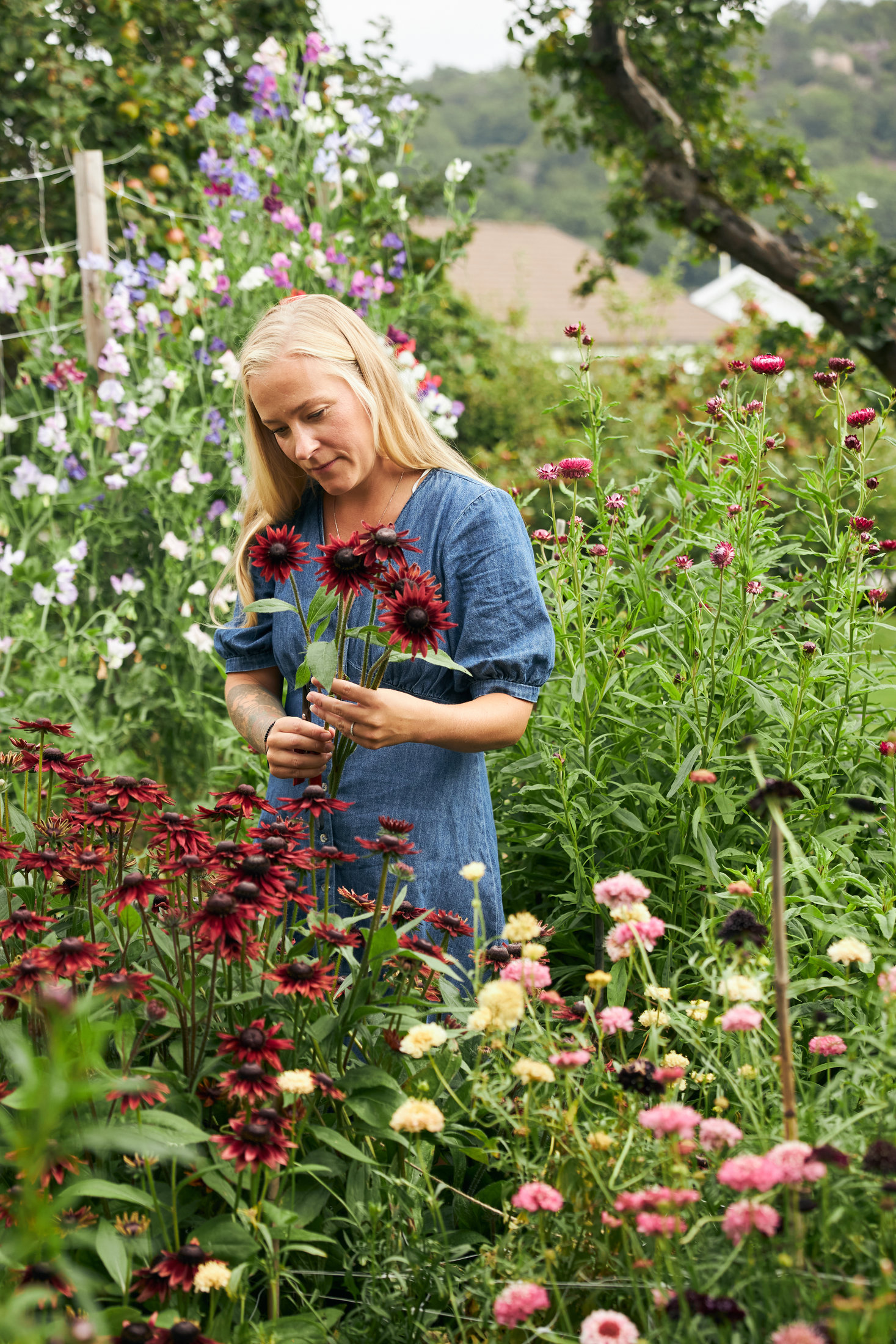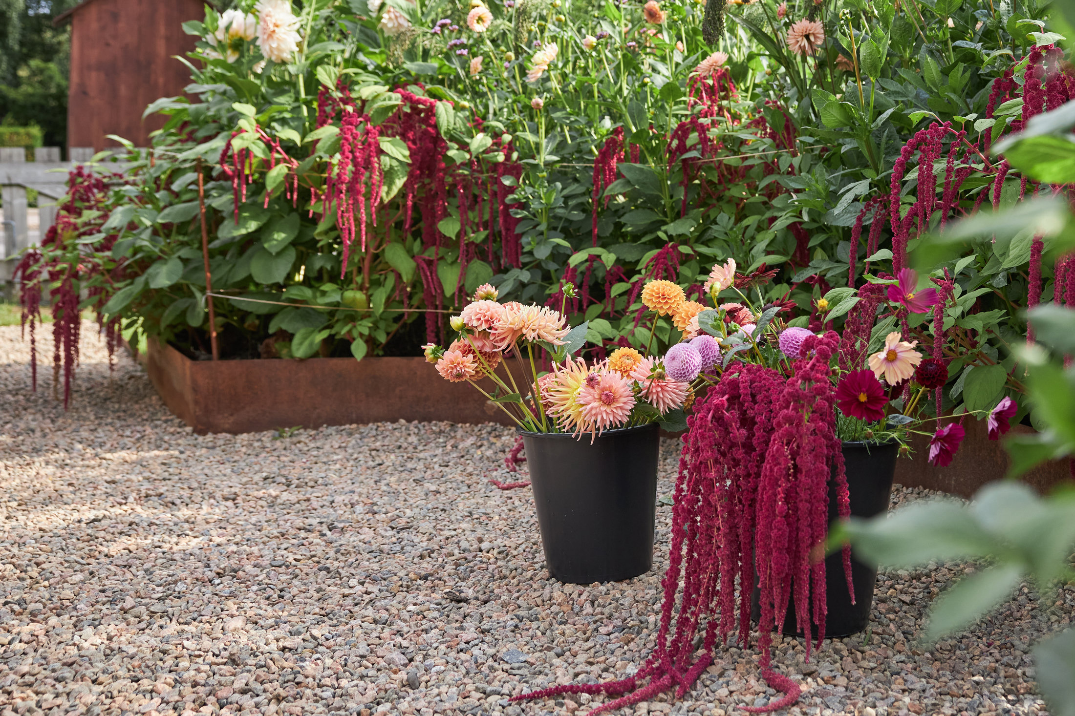 När vi besöker Jenny är det inte långt kvar till bröllop och trädgården står i full blom. Hur ljuvligt det än är med skir rosenskära, gräs och jätteverbenor, för att inte tala om dahlior stora och fluffiga som gräddtårtsbakelser eller dramatiskt droppformade amaranter och rakryggade eterneller – så är det metodiskt och rätt hårt jobb som ligger bakom. Och många arbetstimmar.